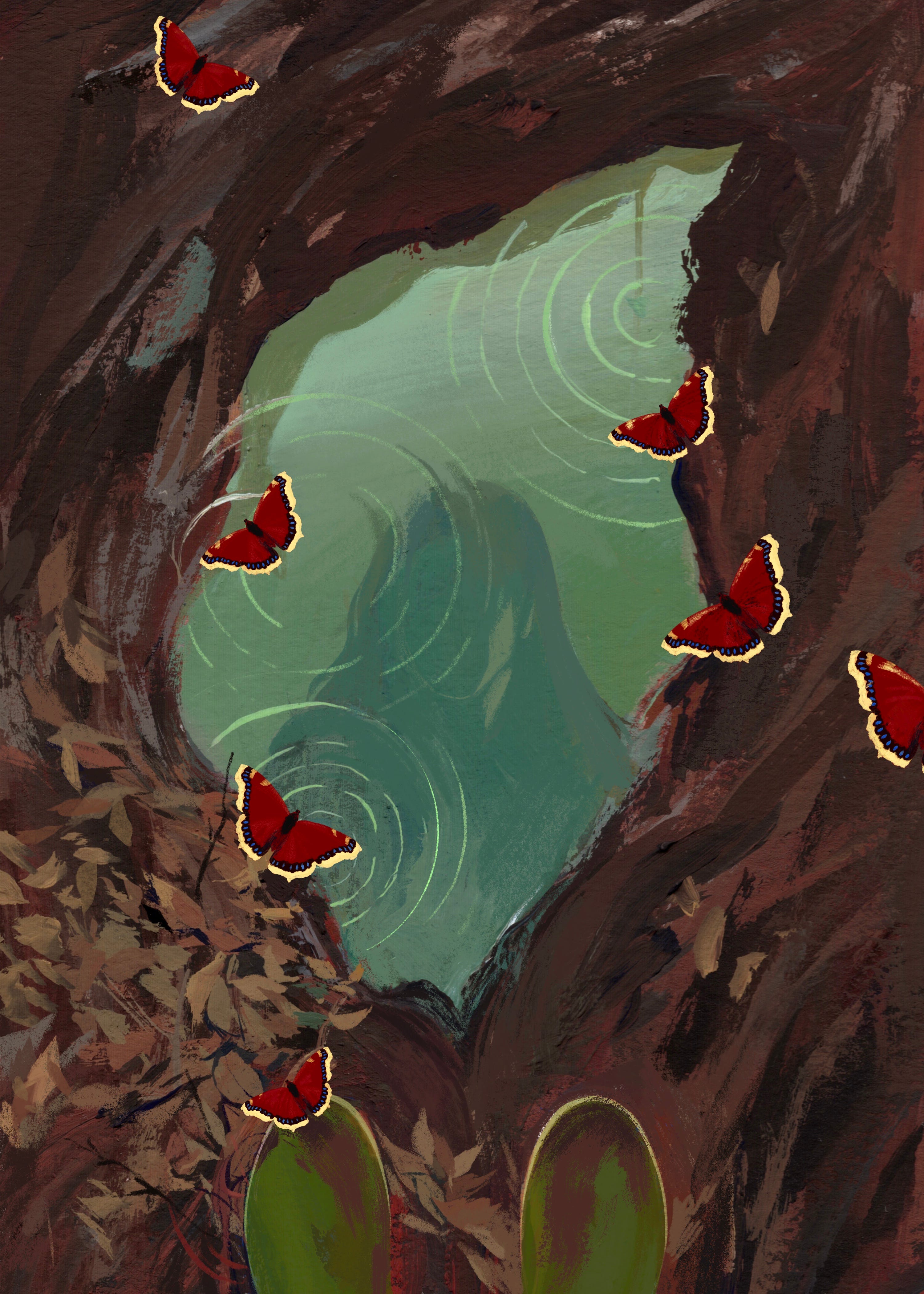 All the specific bugs are mentioned in the story. They picked the sketch with the reflection in the gross puddle and the muddy boots outside the warmly lit cabin. The latter might appear in another edition of “Not Getting Past the Ugly Phase”.